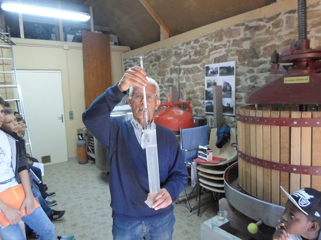 Monsieur Loison montrant un densimètre dans le chai. |