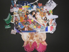 Travail réalisé en troisième. Les élèves devaient composer un portrait en saturant l’espace de dessins, images, textes…