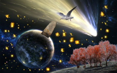 Travail sur l’image réalisé en 5e à l’ordinateur. L’objectif était de créer une image totalement irréelle à partir d’images photographiques de paysages.